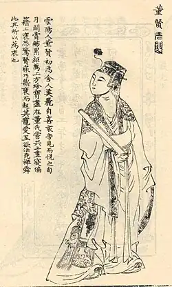 ![]() Dong Xian as depicted in the Wu Shuang Pu (無雙譜, Table of Peerless Heroes) by Jin Guliang | |