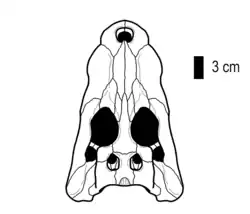 The skull table, a raised part of the skull located behind the eyes, is wider than it is long and bears the two supratemporal fossae. These openings broadly divide the element into two regions, a pre-supratemporal bar (the region between the eyesockets and the fenestrae) and the post-supratemporal bar (the region between the fenestrae and the back of the skull table), with the former being shorter than the latter. The supratemporal fenestrae, located in the wider supratemporal fossae, are only about half the length of the eyesockets, making them the smallest of the skull openings. The frontal bone functions as somewhat of a bridge between the snout and the skull table, stretching from its narrow anterior process until the bone's straight contact with the parietal bone, just before the supratemporal fossa (therefore excluding the frontal from forming part of the openings' rims). To either side of the frontal lie the postorbitals, which form the front corners of the skull table and also contribute to the postorbital bar, while the squamosals form the back corners and the parietals the posterior edge as well as the entire space between the fossae. The supraoccipital bone is also visible on the surface of the skull table through a triangular exposure and in some specimens the bone is ornamented by large pits.[2][3]