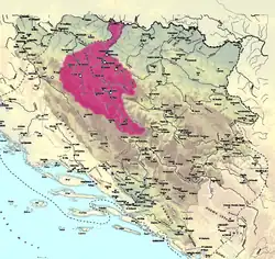 At first, Donji Kraji referred to a region around Ključ on the Sana.[3][4] Marko Vego derives the name of Donji Kraji from the name of Roman province Lower Pannonia, or later Lower Slavonia,[3][5][6] while Pavao Anđelić deduces that the name Donji Kraji (Lower Ends) "also has a certain relation to the rest of (highland) Bosnia", where the terms "Lower" and "End" refers to a border area that is below from the geographical point of view, and in terms of altitude and terrain configuration, in relation to the rest of Bosnia.[7][6] Jelena Mrgić reject existence of "Donji Kraji Slavonije" altogether, and reject previous etymological discussions among historians, such as Klajić, Jiriček and even Vego, and derives the name, similarly to Pavao Anđelić, from geography (altitude and topography) and political demarcation as a product of solely local Bosnian origin.[6] From the 13th century, texts referring to it as "Donji kraji Bosne"[8] or "Donji kraji Bosanski,[6] or "Donji kraji bosanske zemlje".[9][10] During the reign of Hrvatinić family, since the beginning of 13th century, the territory of Donji Kraji included areas and župas around Sana river, Glaž, to Grmeč mountain on the west and to the middle course of the Vrbas river on the east, thus covering entire region of Sanica, and later included Uskoplje, Pliva, Luka, Vrbas, Zemljanik (Resnik), Vrbanja, Tribava (Trijebovo), Mel, Lušci and Banjica, and on occasions Dubica and sometimes even Usora.[11] Vjekoslav Klaić by invoking primary sources and document from 1244, as well as Mrgić, placed the territory of Donji Kraji in northern Bosnia, west from zemlja Usora.[12] This is confirmed by Konstantin Josef Jireček who said: "The Lower Ends (das Unterland) lies in the northwestern (Bosnia) toward Croatia, encompassing Kotor on the Vrbanja, Jajce and Ključ on the Sana [above modern town of Ključ] (Kotor ander Vrbanja, Jajce, Ključ an der Sana u. S. W.)". From the Bosnian Cyrillic scripts of the written monuments, we know that Lušci village was in the Donji Kraji but this place is not known today.[13]