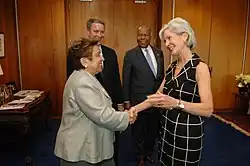 Shalala led the Clinton Foundation during the 2016 presidential election, in which Hillary Clinton was a leading candidate and the propriety of the foundation's activity came under scrutiny.[33] In a September 14, 2016, interview on MSNBC, Shalala admitted that there was "no question" that donors to the Clinton Foundation had been given "courtesy appointments" in the State Department while Hillary Clinton ran that department.[38] Shalala oversaw the termination of the Clinton Global Initiative during her tenure as CEO,[33] as well as other reductions in operations intended to avoid conflicts of interest if Clinton won the election.[39] She resisted calls by The Washington Post and USA Today to shut down the foundation entirely, arguing that "there are human beings around the world who would be affected by these decisions."[40] Shalala left the Clinton Foundation in April 2017 and returned to her full-time teaching position at the University of Miami, replacing her former HHS deputy Kevin Thurm.[33]