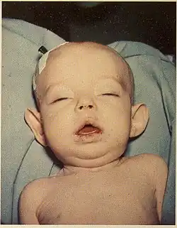 Infant displaying the characteristic symptoms of Donohue syndrome, such as abnormalities in the ears and an oddly shaped cranium.