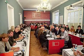 The International Conference to Promote the Resolution of the Conflict in the Basque Country — more widely known as the Donostia-San Sebastián International Peace Conference — was a conference aimed at promoting a resolution to the Basque conflict,[1] which took place in Donostia-San Sebastián (Basque Country) on October 17, 2011, at Aiete Palace. It was organized by the Basque citizens' group Lokarri, and included leaders of Basque parties,[2] as well as six international personalities known for their work in the field of politics and pacification: Kofi Annan (former UN Secretary-General), Bertie Ahern (former Taoiseach of Ireland), Gro Harlem Brundtland (international leader in sustainable development and public health, former Prime Minister of Norway), Pierre Joxe (former Interior Minister of France), Gerry Adams (president of Sinn Féin, member of the Irish Parliament) and Jonathan Powell (British diplomat who served as the first Downing Street Chief of Staff). Tony Blair — former Prime Minister of the United Kingdom — could not be present due to commitments in the Middle East,[1] but he supported the final declaration. The former US President Jimmy Carter (2002 Nobel Peace Prize) and the former US senator George J. Mitchell (former United States Special Envoy for Middle East Peace) also backed this declaration.[3]