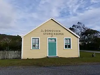 The Donovan's Store building was originally the Club Hotel, built on The Strand in 1865 or 1866 during the gold mining rush at Ōkārito.[1][2] The hotel was converted to a general store in the 1890s and run by James Donovan (1867–1960) and his wife Eva Donovan for about 60 years.[1][3] As well as the Ōkārito port the store serviced the gold dredge workers and flax cutters and Donovan was known for delivering supplies to isolated gold prospectors.[1][2] The store mainly sold foodstuffs but many household and other items were sold such as fabric and tools.[2]