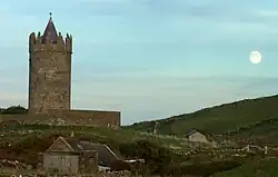 Doonagore Castle sits on a hill overlooking Doolin Point and, along with a nearby higher radio mast, is used as a navigational point by boats approaching Doolin Pier. It is located in the townland of Doonagore, parish of Killilagh, County Clare. It is sometimes considered to be located in the area known as the Burren.[1]:99