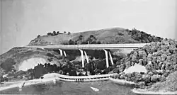 Four arched concrete piers support the twin girder bridges.[1] They use modified Gothic arches;[16] the finish was left in the natural concrete color, and the surfaces were contoured to help them blend into their surroundings.[17] The twin bridges contain five parallel welded steel girders and are connected by a 22-foot (6.7 m) wide concrete slab.[2] The structural steel is concealed by a slanted panel on either side.[1] Bids were opened on April 7, 1965, for the stretch of freeway including the San Mateo Creek Bridge.[3] To minimize impact on the gorge below, materials were lowered from a "high line" built between towers on the adjoining cliffs. It is next to the 1888 Crystal Springs Dam, which was (at the time of its completion) the largest concrete structure in the world.[17] Construction of the first pier began in January 1966.[18]