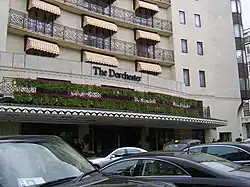 The architectural style adopted by William Curtis Green, largely based on Owen William's design, was a departure from the Neoclassical with its reinforced concrete covered over with terrazzo slabs.[52][4] British Modernists were disappointed with the result, describing Green's adaptation as, "a genteel period piece which looks the compromise it is".[53] In comparison to some of the other hotels in London such as the Lanesborough, the building's exterior is unremarkable. It is eight storeys high aside from the ground floor, with the central bay containing three windows on each floor. Christopher Matthew has stated that he thinks of the Dorchester as a "rather American hotel", not only because of the strong association with American actors such as Elizabeth Taylor, but because the sweeping 1930s facade reminded him of many of those which appeared in American film musicals.[54] However, he notes that the hotel still remains "very much an English hotel".[54] The hotel became a Grade II Listed Building in January 1981.[55]