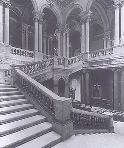 - "The staircase itself is of marble and the steps having broad treads, moderate nosings and very low risers. A flight runs parallel to one side of the gallery to the angle of the wall where there is a landing, and then another flight parallel to the other side to the first floor, with an intermediate landing supported on small open arches. The balustrade is of marble with a broad flat handrail and dwarf pillars with swelling bases"[5]