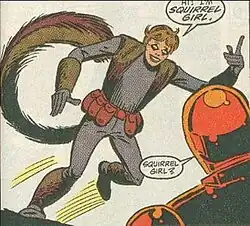 Squirrel Girl later becomes a member of the U.S.Avengers.[38] She later receives a wealthy benefactor in Melissa Morbeck, a woman who can talk to animals who gives Doreen a new "flying squirrel" suit. Morbeck is quickly revealed to be a supervillain, however, who uses technology to exert sadistic control over animals and unleashes an army of insects and wild animals on the city, disguising one of her animal minions as Doctor Doom. While Squirrel Girl, Chipmunk Hunk, and Koi Boi subdue the animal army, Nancy and Mary set off an electromagnetic pulse to disable Morbeck's control over the animals, leading to her arrest.[39] Later stories see Squirrel Girl traveling to the Savage Land[40] and outer space, where she clashes with Loki, Drax the Destroyer, and the Silver Surfer.[41] After she returns home, a clash with a small-time livestreaming criminal inadvertently sends Doreen and Nancy into hypertime; the two girls quickly age into elderly women and become close as they find common interests. They eventually devise a means of reversing time, so they revert back into teenagers and forget their lives together, but Doreen finds a note written by her future self to preserve the memory of the happiness they shared.[42]