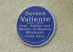 In 2009, the CFPS organised "A Day for Doreen", an event in central London dedicated to Valiente. Sixteen speakers from within the Wiccan and Pagan community came to talk at the event, which was a sell-out.[152] On 21 June 2013, the Centre For Pagan Studies unveiled a blue plaque at the Tyson Place tower block, Valiente's final home. Julie Belham-Payne performed the unveiling at the ceremony, and a speech was given by Denise Cobb, the Mayor of Brighton. It had been preceded by an open solstice ritual in Brighton's Steine Gardens, led by Ralph Harvey.[153]
