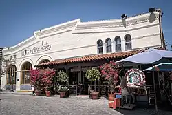 Doria Deighton-Jones built the Simpson-Jones Building in 1894 at the #1 Olvera Street site of the family's 1840s adobe house on the Plaza, which had been torn down in 1886 when Bath Street was widened to make an extension of Main Street.[9] It was constructed to house William Gregory Engines, also known as Moline Engines. Later tenants were the Diamond Shirt Company and the Soochow Restaurant.[9] To its north is the Machine Shop building, built in 1886 on the site of the adobe's stables.[10] After Olvera Street became a Mexican Alta California era-themed shopping area in 1930, the shop's main entryway was switched from the Main to the Olvera facade, and is the present day entrance of El Luz del Día restaurant.[10][11] Its facade was remodeled in 1960 to resemble a mid-19th century Mexican bank. The name honors the Jones' daughter, Constance Jones Simpson.[9] She inherited the property in 1908.[9][11]