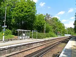 Dormans station is 27 mi 62 ch (44.7 km) down the line from London Victoria via East Croydon.[5] It has two platforms: platform 1 (for northbound trains towards London via Oxted) is 169.0 m (554 ft) long and platform 2 (for trains to East Grinstead) is 167.5 m (550 ft) long.[5][6] The northbound platform is wheelchair accessible, but the southbound platform can only be reached via a stepped footbridge. Passenger help points and seated areas can be found on both platforms.[7]