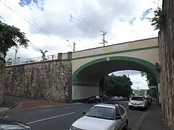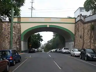 The Dornoch Terrace Bridge was built in 1941 by the Brisbane City Council. It provides a vehicular and pedestrian thoroughfare down Dornoch Terrace towards the Brisbane River. Built as an overpass across Boundary Street, the bridge allows access to the road below by a series of staircases and a slip road.[1]