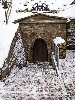 In the 16th century, mining activities in Cunersdorf started. Due to the high yields, the mine quickly gained popularity. As of 1536, they earned 2409 Guldengroschen per Kux (non-material shares of a mine) in 2 and a quarter years. This was mainly due to a high concentration of silver (up to 40 %) in a lode. However, yields fell again in the following years.[2] During the construction of an shaft, the year 1551 was discovered 125 m below the ground.[3] The entrance that is still used today was constructed in 1853.[4] The mining started with silver ore, later, also nickel, copper, uranium and cobalt ore was obtained.[3] After World War II, in 1946/47, the SAG Wismut began searching for uranium in Annaberg-Buchholz, also in the Dorothea-Stolln. Uranium mining lasted only a short time and ended in 1958.[5]