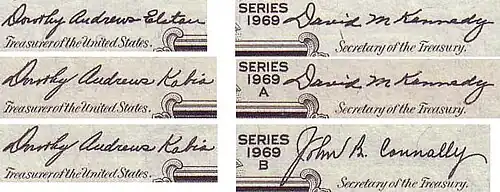 As Elston, Kabis signature appeared on the series 1969 one-dollar bill. The resulting change in Kabis' signature appeared first on the Series 1969A note, so designated to show a different name as treasurer, even though it was the same person.[5]