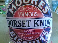 In the past there were a number of producers of Dorset knobs. Today the only firm to produce them commercially is Moores Biscuits, which used to be sited in Morcombelake, four miles west of Bridport in the west of the county of Dorset in England,[2] but has now moved into Bridport itself.[4] The Moores family have baked biscuits in Dorset since before 1860. The bakery was established in 1880 by Samuel Moores and manufactures a variety of traditional biscuits in addition to the Dorset knob. Dorset knobs are only produced during the months of January and February.[1] They are normally sold in a distinctive and traditional tin.