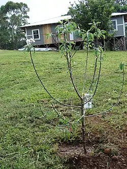 Dorsett Golden is a 'Golden Delicious'-like cultivar of domesticated apple and is descended from it, but is different with that it is early season, and most importantly, it needs a lower amount of cold weather (less than 300 hours) to go into blooming, so it is possible to grow in warm climates.[2]