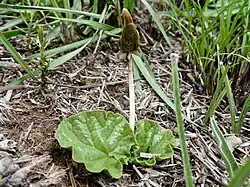 The variety D. b. var. tropaeolifolia, found across most of the species' area,[2] is the smallest known member of the family Moraceae. It has a single peltate leaf 3 cm (1.2 in) diameter springing from a tiny tuber 16 mm thick, with the leaf's petiole being 4 cm (1.6 in) height.[3] As with other Dorstenia species, the tiny flowers coat the upper surface of a disk-like inflorescence.