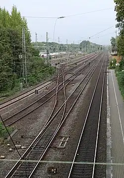 At Deusen junction it also formerly connected with the link to the former Dortmund freight yard (Dortmunder Güterbahnhof), which was located just north and parallel with the Duisburg–Dortmund railway and has been disused since 30 June 2004.[3][4] As described in the following section, it next connects at Buschstraße junction with the former Emscher Valley Railway of the Royal Westphalian Railway Company from Dortmund Bodelschwingh to Dortmund-Huckarde Süd, now used by line S2 of the Rhine-Ruhr S-Bahn.[5]