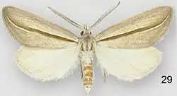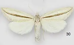 The wingspan is about 33 mm for males and 41 mm for females.[3] The forewings are pale olive ocherous, broadly shaded with pale purplish along the costa and inner and outer margins. The hindwings are whitish.[4] Adults have been recorded on wing in October and November.