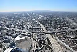 By 1957, the California Division of Highways (now the California Department of Transportation) had accounted for an interchange in planning the construction of the Santa Monica Freeway, with construction of the interchange being included in the freeway's initial segment which started at the East Los Angeles Interchange.[2] Construction work for the initial segment, valued at $8.4 million ($69.7 million in 2023 dollars),[2] began that summer on June 17, 1957,[3] with major grade separation and rerouting work for the interchange, requiring the temporary rerouting of the Harbor Freeway and the diversion of Venice Boulevard, taking place the following year.[4] In common with the East Los Angeles Interchange, which was built in the middle of majority-Hispanic Boyle Heights, the interchange's construction displaced an entire neighborhood — described by the Home Owners' Loan Corporation as being "thoroughly blighted" — primarily inhabited by African Americans, along with smaller numbers of Mexicans, Japanese and Italians.[5]