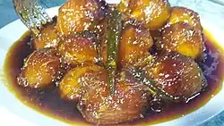 Dosi (Sinhala: දෝසි, Tamil: தோசி) is a traditional Sri Lankan confectionery,[1] similar in nature to fruit preserves or candied fruit. The dish is prepared by boiling segmented fruit in sugar and allowing it to cool in order for the sugar to crystallise on both the surface and the inside of the fruit. Dosi are traditionally served as a snack, during the day or after a meal.[2] It is a dish that is commonly served by Sri Lankan Malays as a part of traditional Eid al-Fitr celebrations, marking the end of Ramadan. It is also popular during weddings, religious festivals and other social functions and celebrations. Variations include the addition of cardamom and/or cinnamon and/or rose essence.