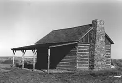 The log cabin was used as the blacksmith's residence. It is a 1+1⁄2-story, hand-hewn log structure. All of the logs have been squared and have dovetailed ends that lock the log joints together. The cabin's footprint is 16 feet (4.9 m) by 24 feet (7.3 m). The cabin has a wooden floor and a cedar shingle roof. There is a porch on the south side of the building that shelters the main door. On the north side there is a second door and two windows. The structure was restored in 1979. The restoration project replaced the doors, windows, and roof. The porch and fireplace were also repaired, and a concealed concrete foundation was placed under the structure.[4]