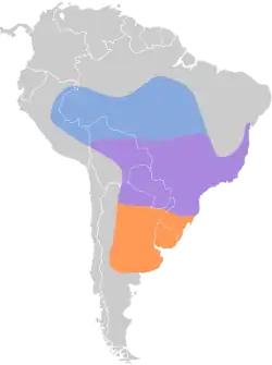 It is found in Argentina, Bolivia, Brazil, Paraguay, Peru, and Uruguay, as well as the southern border of Colombia on the Amazon River. Its natural habitats are subtropical or tropical moist shrubland, pastureland, and heavily degraded former forest.