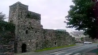 Parts of the parapet in the section of the city wall to the southeast of the tower have survived to this day. However, at the northwest end, the original stepped crenellations can still be seen rising upwards to abut onto the tower. This feature is a rare survival on the Waterford city wall. The remains of an overhanging wall walk can still be seen running along the inside of the wall between the Double Tower and the Watch Tower. However, the battlement does not survive along the top of the city wall to the northwest of the Double Tower.[2] The Double Tower was built as a freestanding structure on the remains of an earlier gateway. The two adjoining sections of the city wall at either end were built later. It is likely that the section of the wall to the northwest that runs downhill from the French Tower was built first, and then the wall running southeast that goes to the Watch Tower.[2] All three towers are visible from Castle Street.