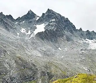 Doublemint Peak, also known as Doublemint Spires or simply Doublemint, is located 19 miles (31 km) north of Palmer, Alaska, in the Talkeetna Mountains and in the Hatcher Pass Management Area of the state park system. The south spire is 6,372-ft and the lower north spire reaches 6,308-ft elevation.[1] Precipitation runoff from this mountain's west slope drains into headwaters of the Little Susitna River, whereas the east side drains into Moose Creek which is a tributary of the Matanuska River. Topographic relief is significant as the summit rises 3,372 feet (1,028 meters) above Little Susitna River in one mile (1.6 km). The nearest higher neighbor is Troublemint Peak, 0.6 mile (1 km) to the north.[3] The approach to the peak is via the eight-mile Gold Mint Trail which reaches the Mint Glacier Hut. Doublemint was so named in July 1968 by Curt and Gretchen Wagner who compared the granite towers to those in The Bugaboos.[4] Other whimsically named peaks near the Mint Glacier include Spearmint Spire, Triplemint Peak, and Telemint Spire. This mountain's toponym has not been officially adopted by the United States Board on Geographic Names.