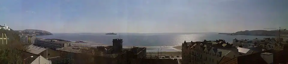 View of the bay showing visible landmarks of the Castle Mona hotel staircase turret (centre) and Onchan Head to left