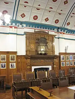 The design involved an asymmetrical main frontage of 11 bays facing onto Ridgeway Street. The left-hand section of four bays formed the public library: the fourth bay on the left featured a round headed opening with an open segmental pediment. The other bays were fenestrated with round headed windows on the ground floor and with sash windows on the first floor. The first two bays were surmounted by a gable containing an oculus. The right-hand section of seven bays formed the town hall: the third bay on the right featured a round headed opening with a triangular pediment. The other bays were fenestrated with sash windows on both floors and the first four bays on the left of the town hall section were surmounted by a gable. Internally, the principal rooms were the offices of the council officers on the ground floor and the council chamber, which was 47 feet (14 m) long and 32 feet (9.8 m) wide, on the first floor. The council chamber was panelled and featured an ornate arched ceiling designed by Warings of London.[6]