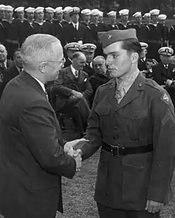 Major Douglas Thomas Jacobson (November 25, 1925 – August 20, 2000) was a United States Marine who earned the United States' highest military honor — the Medal of Honor — for his heroic actions on Iwo Jima during World War II.[1] "Private First Class Jacobson destroyed a total of sixteen enemy positions and annihilated approximately seventy-five Japanese, thereby contributing essentially to the success of his division's operations." He was presented the Medal of Honor by President Harry S. Truman on October 5, 1945.[1]