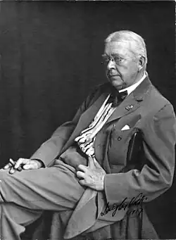 He was one of eight American artists commissioned by the National Art Committee to depict major figures from the Great War (World War I).[9] His three portraits – King Albert I of Belgium (1919), standing in uniform on a battlefield; British Prime Minister David Lloyd George (1919–20), seated at his desk; General John J. Pershing (1920–21), standing in uniform with his horse's reins in his hand – were donated to the National Portrait Gallery. The first two were later transferred to the Smithsonian American Art Museum. An abandoned version of Volk's Pershing portrait showed the general standing beside the grave of an unknown soldier.[10]