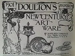It always made some more decorative wares, initially still mostly stoneware, and from the 1860s, the firm made considerable efforts to get a reputation for design, in which it was largely successful, as one of the first British makers of art pottery.[2] Initially this was done through artistic stonewares made in Lambeth, but in 1882 the firm bought a Burslem factory, which was mainly intended for making bone china tablewares and decorative items. It was a latecomer in this market compared to firms such as Royal Crown Derby, Royal Worcester, Wedgwood, Spode and Mintons, but made a place for itself in the later 19th century. Today Royal Doulton mainly produces tableware and figurines, but also cookware, glassware, and other home accessories such as linens, curtains and lighting.