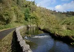 The River Dove is a famous trout stream, 45 miles in length.[14] Charles Cotton's Fishing House, the inspiration for Izaak Walton's The Compleat Angler,[15] stands in the woods by the river. From Hartington to its confluence with the River Manifold at Ilam the River Dove flows through the scenic limestone valley known as Dove Valley,[16] or Dovedale. From Hartington south to Ilam, a distance of eight miles (13 km), the Dove flows through Beresford Dale, Wolfscote Dale, Milldale, and then Dovedale.