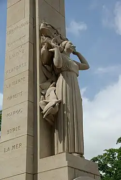 | Monument to Carrier Pigeons[41] | Lille, France | 1936 | This stone monument depicts a woman flocked by birds, erected in honor of the approximately tens of thousands of birds who served as carrier pigeons or otherwise served the Triple Entente during World War I. The statue is in front of the Lille Zoo. It was erected by the édération Nationale des Sociétés Colombophiles (National Federation of Pigeon Societies).[42] |