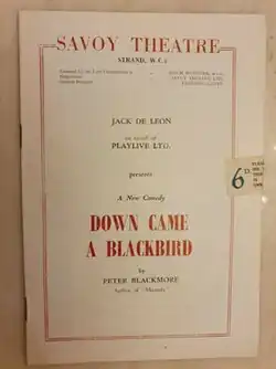 Down Came a Blackbird is a 1953 comedy play by the British writer Peter Blackmore. It was first staged at Q Theatre in London before transferring to the West End where it ran for 53 performances at the Savoy Theatre between 22 December 1953 and 6 February 1954. Directed by Henry Kendall the cast included Peter Arne, Viola Keats, John Loder and Betty Paul.[1] The title is taken from a line in the traditional nursery rhyme Sing a Song of Sixpence. It takes place entirely in the garden room of the Egyptian villa of Sir Clive Dawson.