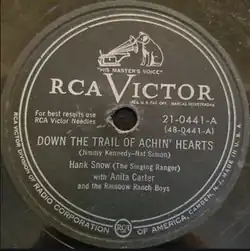 "Down the Trail of Achin' Hearts" is a country music song written by Jimmy Kennedy and Nat Simon, recorded by Hank Snow and Anita Carter, and released on the RCA Victor label. In May 1951, it reached No. 2 on the US country charts.[1] It spent 14 weeks on the chart and was the No. 12 country record of 1951 based on juke box plays.[2][1]