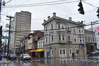 Some buildings in the district were constructed after fires in 1875 and in 1917 destroyed previous buildings, and other historic buildings were destroyed by urban renewal. This list of contributing properties includes the street group and where available the name, year, address, architect, and style of each building.[2]