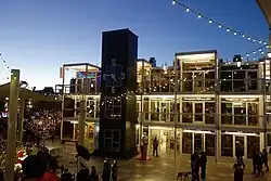 Downtown Container Park had a soft opening on November 25, 2013.[6][16] A larger grand opening was held on December 5, 2013.[16][35] The Container Park had 153 employees,[36] and 34 tenants,[37][38] including restaurants, bars, art shops, and clothing stores.[39][33][40] The mall includes 43 shipping containers and 41 cubes,[41][42] with a total of 38 tenant spaces, although some businesses occupy two spaces, causing a fluctuation in the number of tenants.[43] Tenant spaces range from 170 to 800 square feet.[1] Interior dining space is limited in each cube, necessitating the use of outdoor dining tables.[44][45] The containers, stacked two and three high, were customized for the needs of each business, and were fitted with insulation and windows.[16] In addition to cubes and shipping containers, a railroad caboose was also retrofitted for the project, to house a barbershop.[15][39] The Downtown Project avoided chain stores in favor of unique tenants.[15] To further maintain a unique shopping experience, tenants were strategically chosen by the Downtown Project in order to avoid having two businesses that offer the same products.[41]