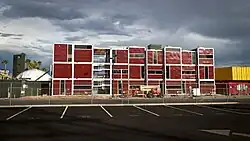 Breslin Builders was the general contractor.[7] Although the project was originally intended to consist only of shipping containers, the design plans were altered to include metal cubes.[13][14] The cubes, created locally by Xtreme Manufacturing, were usually made for gas, mining and oil excavations. The Downtown Project decided to use cubes for the Container Park after learning of Xtreme Manufacturing, which was headquartered near downtown Las Vegas.[14] The project's shipping containers were provided by ConGlobal Industries, a Los Angeles company. [7][15] The use of shipping containers was originally seen as a possible cost-saving way to construct the project. However, when the plans were expanded, the final construction costs were roughly equal with traditional building methods.[16]