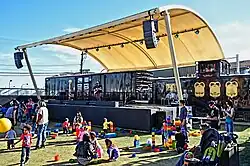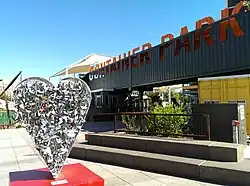 The entrance is marked by a giant metal sculpture, depicting a praying mantis that spews fire from its antennae.[15][46][47] The mantis also plays music through seven speakers. An individual operates the mantis from a small interior space.[48] The sculpture was originally built for the annual Burning Man festival.[25] Also located at the entrance is the Love Locket, a heart-shaped sculpture made of metal. Visitors are allowed to attach love locks to the sculpture, which was originally created for the first Life Is Beautiful festival.[49][50] An outdoor stage is located on-site,[51] and has hosted various musical performances.[52][53][54] The playground area includes an artificial tree and treehouse made out of four shipping containers, with slides and interactive play panels.[7][11]