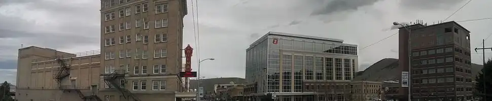 The Higgins and Front area of downtown is considered the center of downtown. It began to grow in the late 19th century and has been growing since. In the early 20th century this part of downtown had electrified streetcars.[8] Its last run in the city was in January 1932.[8] Brick street's were replaced in the 1940s and 1960s.[8] This area has received national recognition for preserving historic properties.[8] Most of Missoula's main downtown buildings in the city are here. They include the Wilma Building, and Wilma Theatre. Others include the Millennium Building, the First Interstate Center, the Florence Hotel, and the newly constructed Garlington Building.