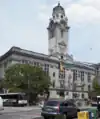 After a devastating fire in 1902, the city rebuilt the downtown with massive Beaux-Arts-style buildings, many of which remain to this day.[1][2][3] and are contributing properties to the Downtown Commercial Historic District.[4] These buildings are usually four to seven stories tall. Downtown Paterson is home to City Hall and the Passaic County Court House, two of the city's architectural landmarks. City Hall was designed by the New York firm Carrere and Hastings in 1894 and is modeled after the Hôtel de Ville (city hall) in Lyon, France, capital of the silk industry in Europe. Downtown abounds with buildings designed by Fred Wesley Wentworth, some in collaboration with his draftsman and later partner Frederick J. Vreeland, who worked in the city from the turn of the century to the 1930s.[5][6] The Cathedral of St. John the Baptist survived the fire. As the county seat Paterson is home to the Passaic County Court House complex, Passaic County Community College, and several federal and state offices. Center City Mall is a 320,000-square-foot (30,000 m2) shopping mall at 301 Main Street opened in 2009. The massive Masjid Jalalabad mosque, which can accommodate 1,500 worshippers, is located on Van Houten Street. Paterson Broadway Bus Terminal is a major regional bus terminal. Downtown has a diverse ethnic makeup with large Dominican, Puerto Rican, Peruvian, and Mexican populations. Little Lima is the largest Peruvian American enclave in the United States.[7]