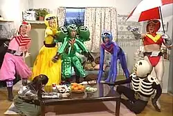 - In the first episode, they have three red renjai and two yellow (breaking the usual sentai convention of having each hero in a different colour). Dokuro Kamen lectures them and tells them to try better next time. Each subsequent episode has Dokuro Kamen attacking the same woman in the same room (often stopping for a friendly chat with the lady's friend before he attacks her), and the renjai appearing in mismatched costumes -- such as Tiger Mask, Falkor, and a waitress from a No-pan Shabu shabu-- or ridiculously modified versions of their uniforms. The episodes end with Dokuro Kamen scolding the renjai, pointing out exactly what is wrong, and sending them off home.