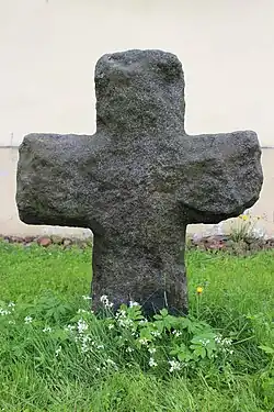 • Church of St. Lawrence – Gothic Revival, a deanery sanctuary. It houses an 1804 painting of The Martyrdom of St. Lawrence by Karl Sigismund and St. Lawrence's relics installed in 1999. Outside, a likely late-medieval granite stone cross,[23] often misidentified as a conciliation cross, though no evidence supports this. The assumption that all old monolithic stone crosses are penitential lacks substantiation,[24] as their origins could vary.[25][26] This hypothesis has become popular but is often presented without noting its speculative nature.[27]