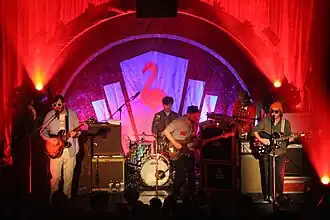 Dr. Dog is an American rock band based in Philadelphia.[1] Its lineup consists of Toby Leaman (bass), Scott McMicken (lead guitar), Frank McElroy (rhythm guitar), Zach Miller (keyboard), Eric Slick (drums), and Michael Libramento (percussion, lap steel, acoustic guitar, bass). Lead vocal duties are shared between Leaman and McMicken, and all members contribute harmonies. In addition, each band member has a nickname beginning with the letter T and they have explained that friends of the band also receive nicknames, which are drawn from aspects of their lives and personalities. (Former member Andrew "Trial" Jones, for example, is a licensed attorney.)[2]