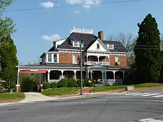 Dr. J. Howell Way House is a historic home located at the south end of Main Street Waynesville, Haywood County, North Carolina. The brick home was once a modest smaller brick home owned by the Welch family, relatives of Robert love the father of Waynesville. The original home pre dates the civil war and parts of the current structure dates to before the war. In 1888 Dr. J. Howell Way, a prominent physician, married Marietta Welch and in 1894 the small home was acquired, along with an 11-acre tract of land. Soon after dr. Way built a medical office and by 1899 had completed one of the areas most distinguished homes. The home is a large 3+1⁄2-story brick dwelling retaining a lot of the woodwork, large carved fireplaces, and grand staircase with Queen Anne and Colonial Revival style design elements. It also features a full attic and widow's walk on the very top of the structure. It has a complex roof system composed of a broad hip broken with projecting gables and shed dormers; a one-story, hip roof front wraparound porch and second floor balcony; porte-cochère, and a projecting three-sided, two story bay. Also on the property are the contributing medical office and carriage house.[2]