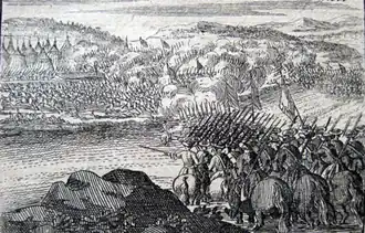 The Drabants quartered at Krasna Luka when Charles launched a costly assault on Veprik, on 18 January 1709.[168] During the night of 11–12 May, the king laid siege to Poltava.[169] On 18 May, the Russians attempted to force Charles to end the siege by attacking Opishnia. The Drabants fought alongside the king and forced the Russians back over the Vorskla, losing 200 killed to 150–200 Swedes.[170] On 26 June, the Russians again crossed the river and prepared an ambush. Smaller skirmishes were initially fought against the Cossacks of Ivan Mazepa (allied to Charles since late 1708). When the Drabants arrived they compelled the Russians to retreat without a fight.[171]