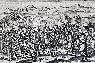On 6 September, the corps participated in the Storming of Lemberg (Lviv) in which Drabant Jöran Silfverhielm personally captured the garrison commander, Franciszek Gałecki, hiding in a Jesuit monastery.[117][118] The Drabants then witnessed the Polish surprise attack on the Swedish camp outside the town. When the king received news of Arvid Horn's surrender at Warsaw,[m][120] he marched back to expel the Saxons from Poland. When the Swedish army crossed the Vistula by the end of October, the enemies fled Warsaw. Many were captured in the pursuit.[121] At one occasion, three Drabants disarmed and captured 21 Russians and Saxons.[122] The Drabants, unable to catch up with the king, instead marched with Otto Vellingk's army. On 1 November, they encountered 300 cavalries in a rearguard, killing most of them while capturing a major and 60 soldiers.[123] Vellingk, along with his five regiments (including the Drabants), arrived at Poniec the day after the battle and then marched to Tillendorf.[124][125] There, on 8 November, they intercepted 600–700 Russians in a wagon fort; the Russian force was annihilated after a brave defence—five were captured and the rest killed,[126] against 21 killed and 50 wounded Swedes. By the end of the month, Charles and the Drabants went into cantonment around Rawicz.[127]